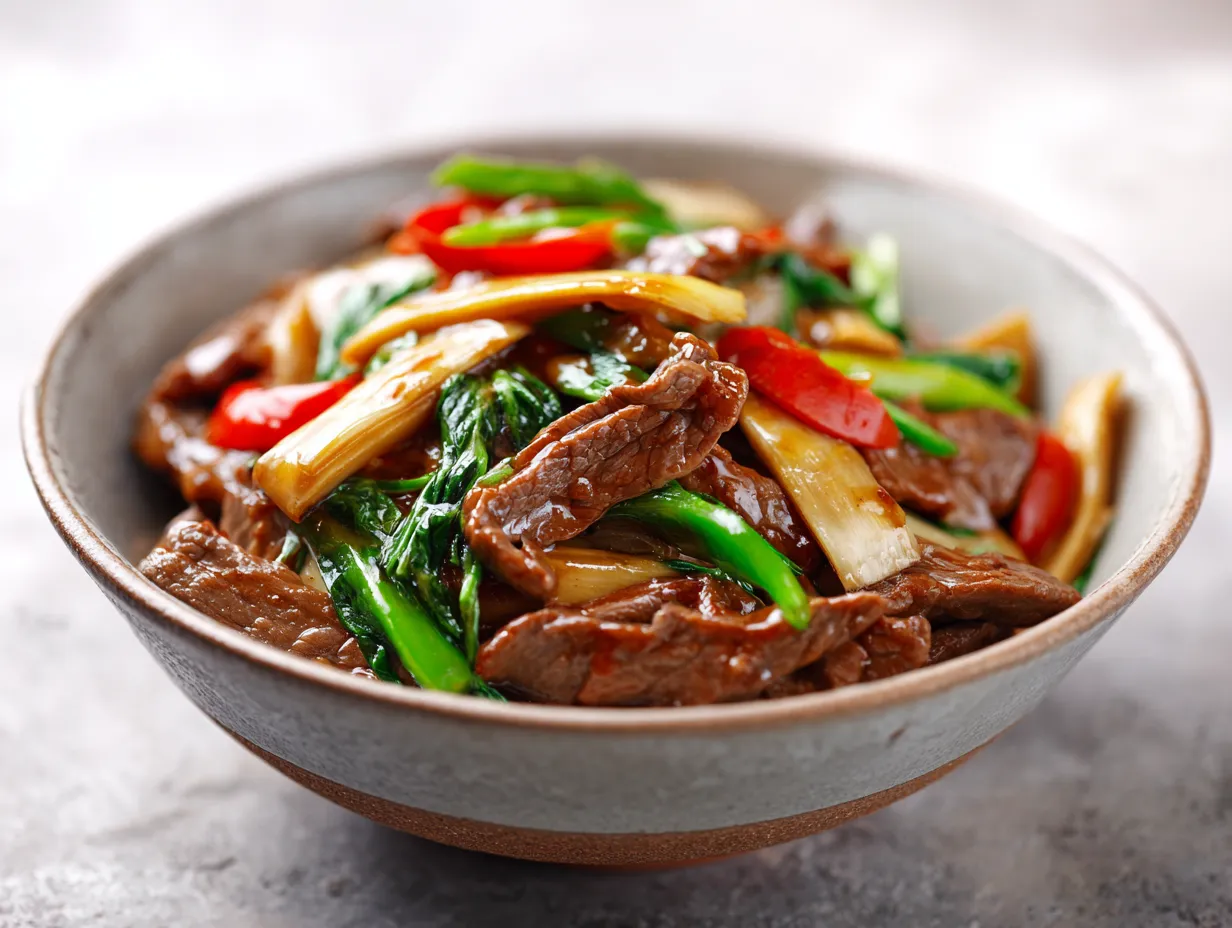 Detta recept hjälper dig att laga en smakrik kinesisk wok hemma med mör biff och krispiga bambuskott. Biff med bambuskott kinesiskt balanserar sälta och sötma med hoisin, ostronsås och soja för en trygg och uppskattad middagsrätt.