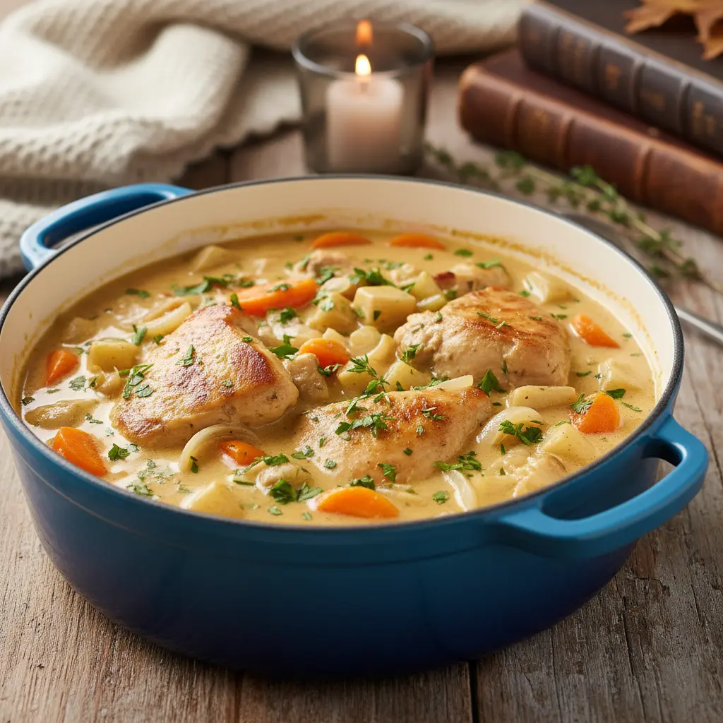 Recept hel kyckling – värmande gryta med rotfrukter, timjan och grädde. Mustig, enkel och perfekt för söndagsmiddagen. Servera med potatis eller bröd.